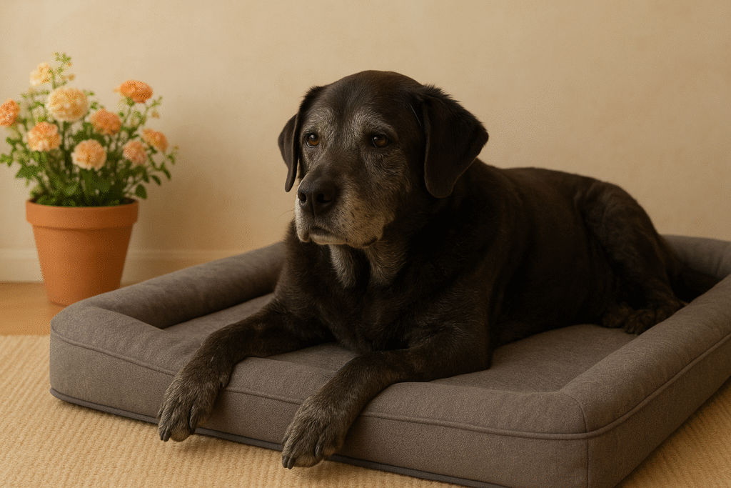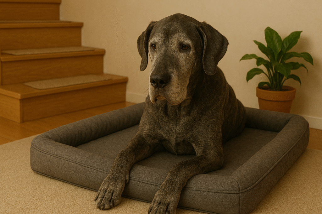 Cão sênior de grande porte descansando em ambiente adaptado