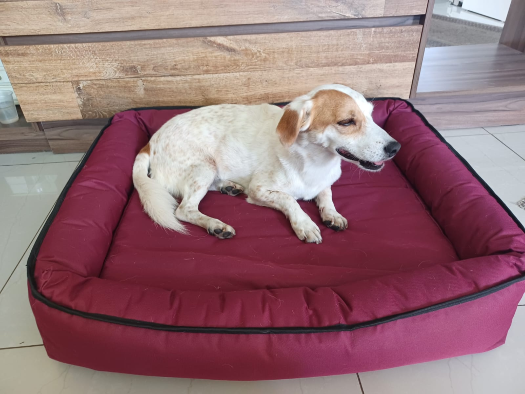 Loli aproveitando o conforto do seu colchão magnético para cães