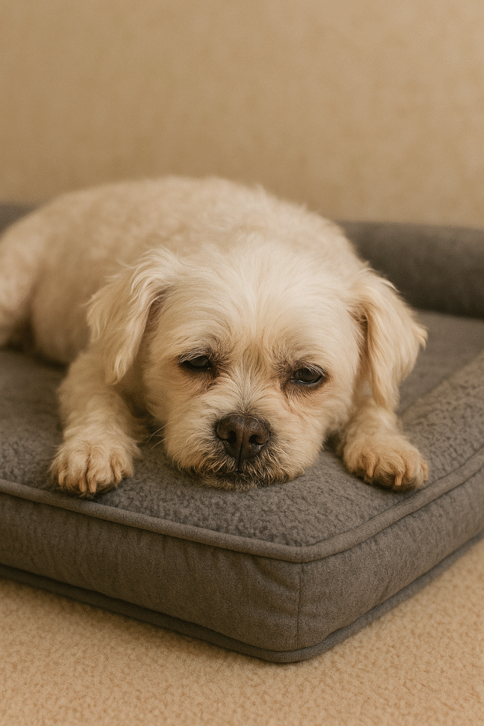 Cão idoso visivelmente desconfortável