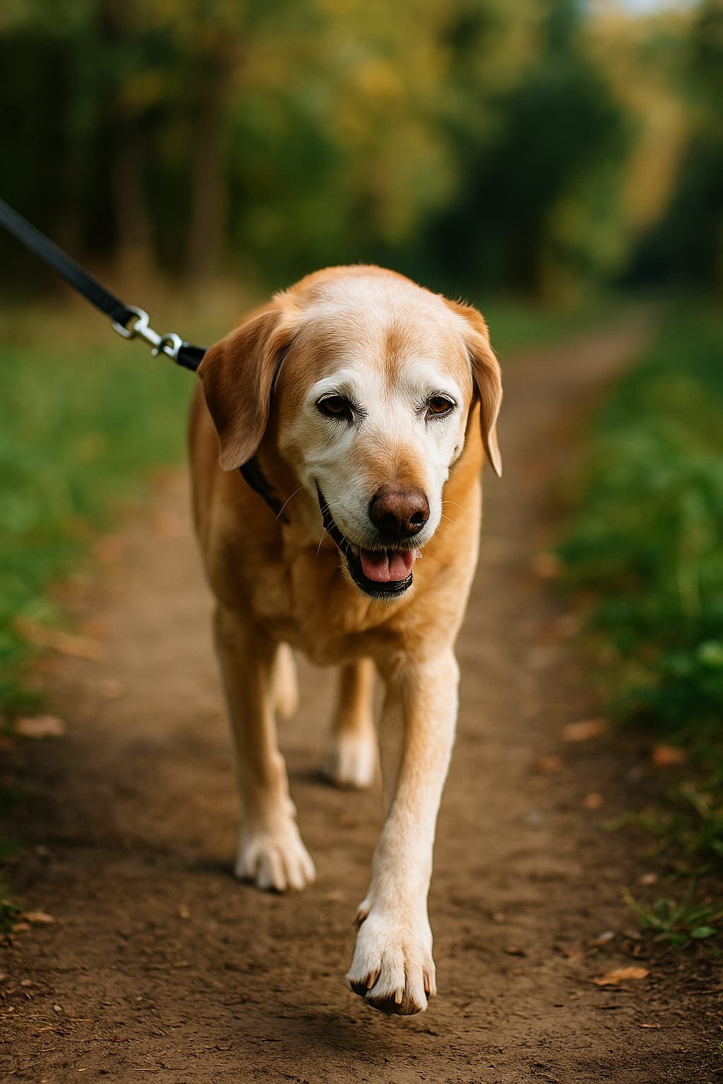 Cão idoso fazendo exercícios ao ar livre para manter a saúde na terceira idade.