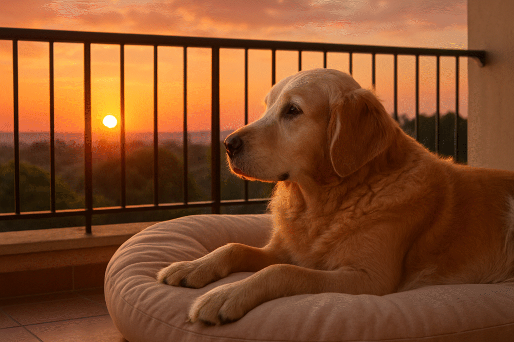 Cão idoso descansando ao pôr do sol após a alimentação natural, parte da rotina de cuidados e bem-estar.