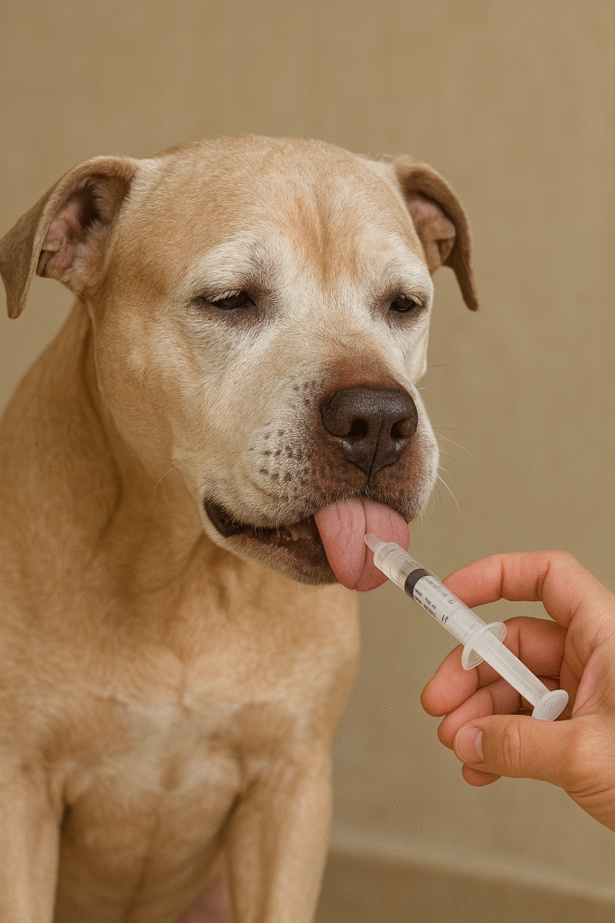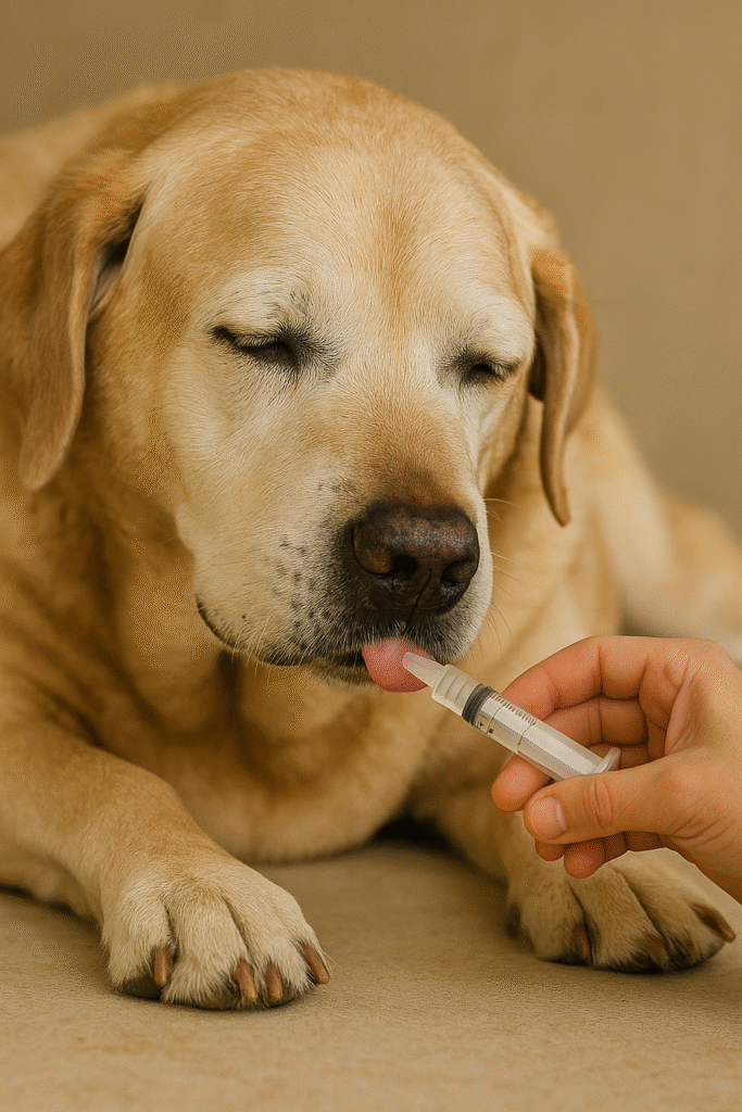 Cão sênior recebendo alimentação na seringa