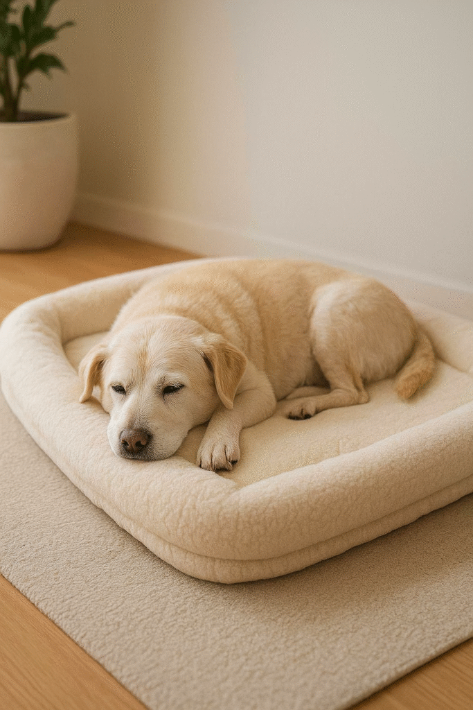 Cão idoso descansando em caminha macia em um ambiente calmo