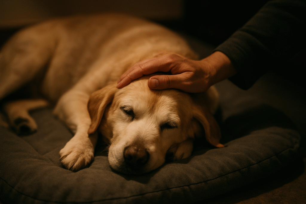 Tutor acalmando cão sênior durante a noite