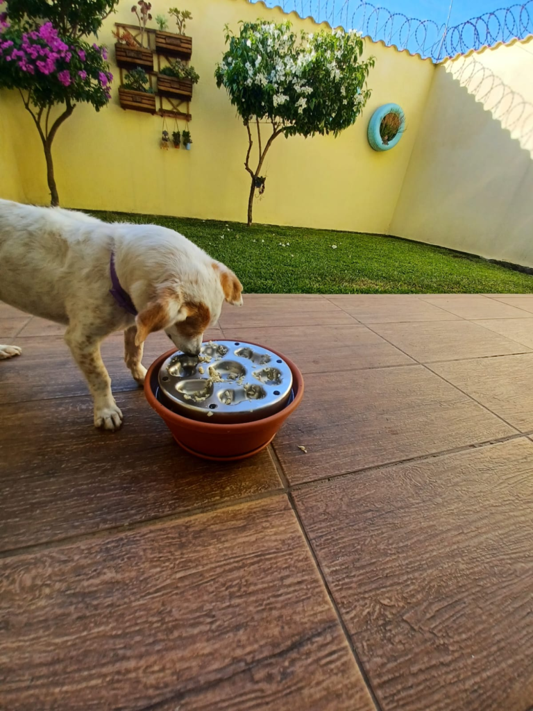 Loli em seu hábito alimentar cuidadosamente organizado, integrado ao uso de ômega 3 para cães idosos.