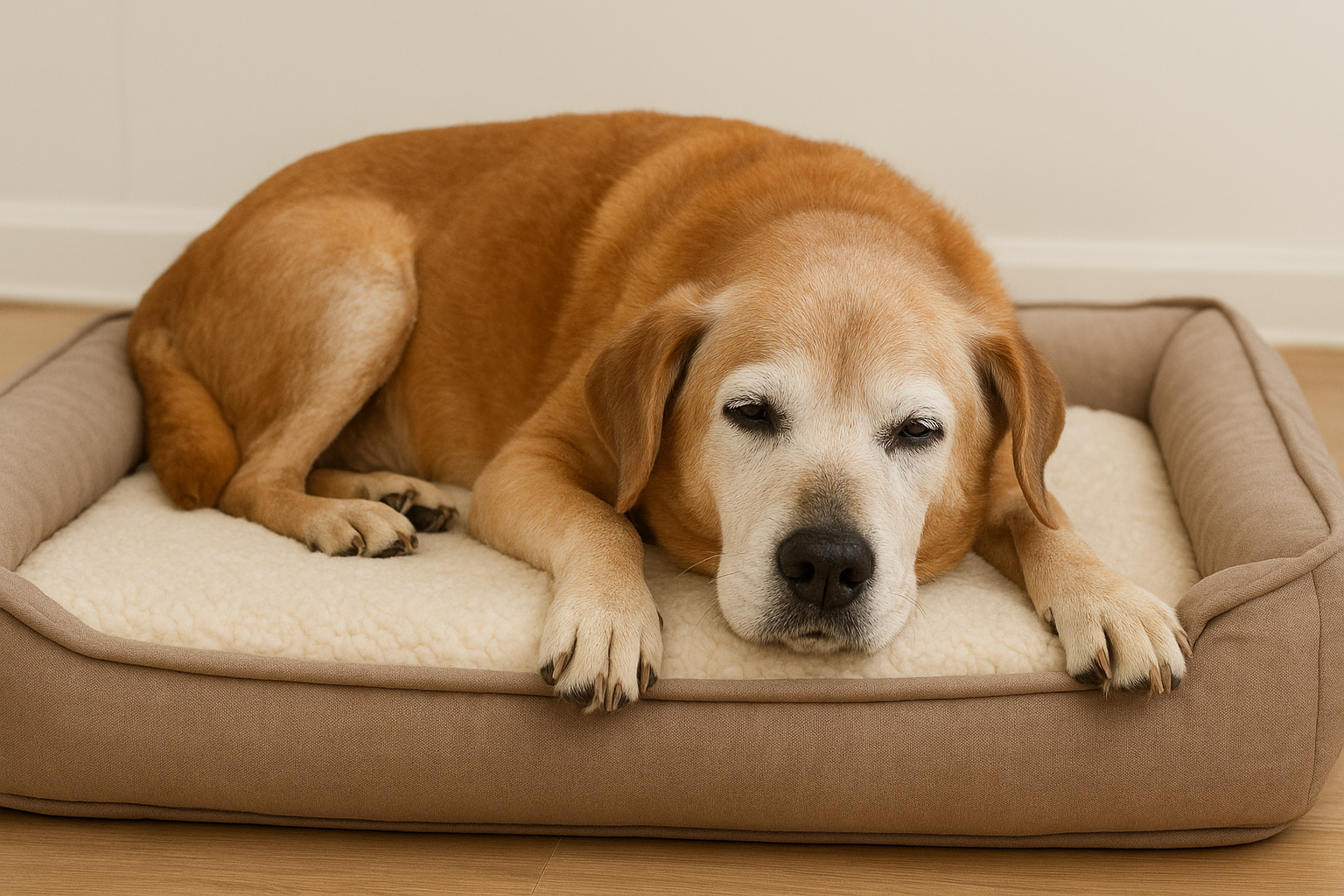 Cão sênior descansando em cama ortopédica
