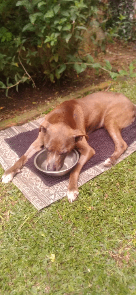 Goe hidratando-se sentado, um retrato sereno dos sinais de envelhecimento em cães